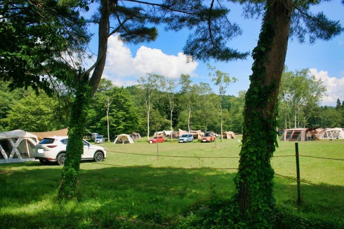 雄大な自然の中にある芝生のフリーサイト!芝生への車両乗り入れOK!ペットエリア完備でペット連れ利用OK!
