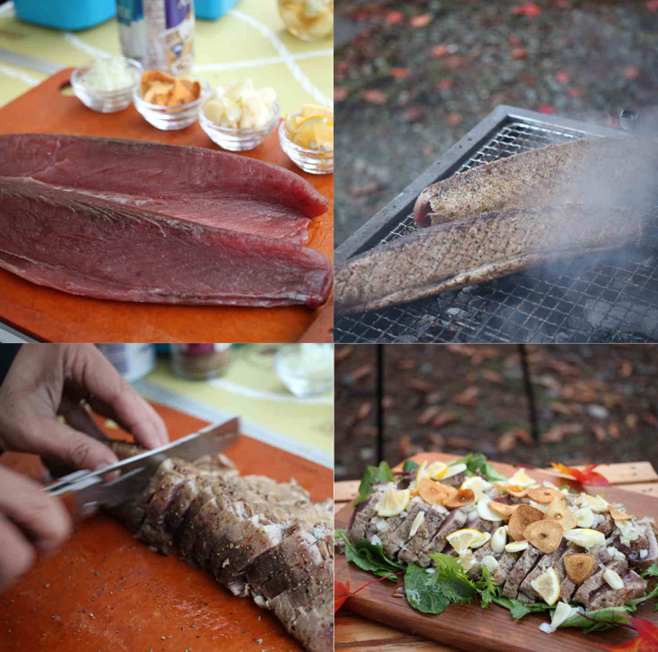 かつおは黒瀬のスパイスをたっぷりまぶして、表面をあぶる。