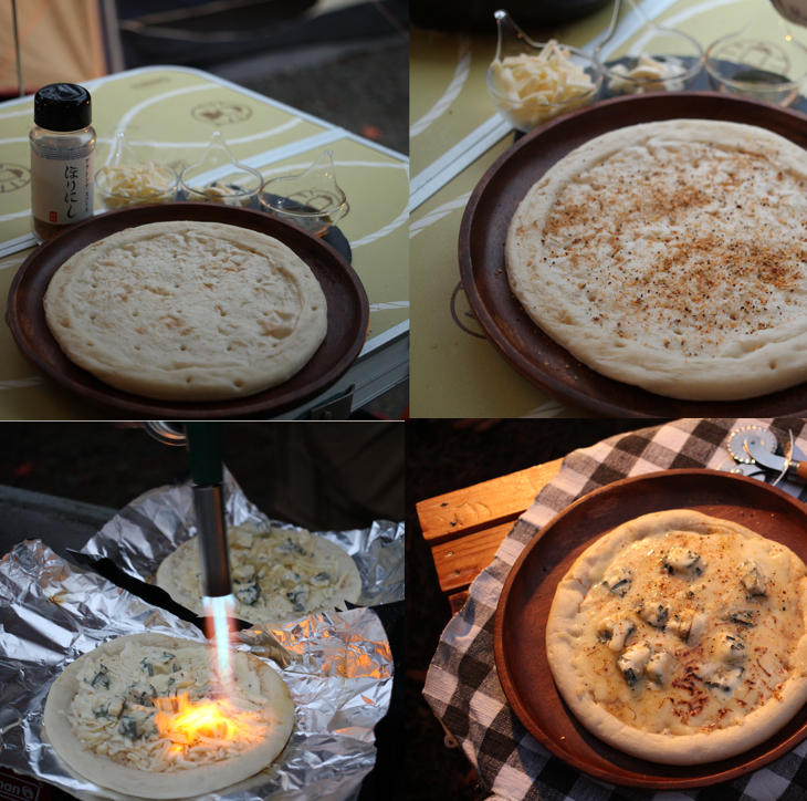 ピザ生地に、チーズ類を散らし、ほりにしをふる。