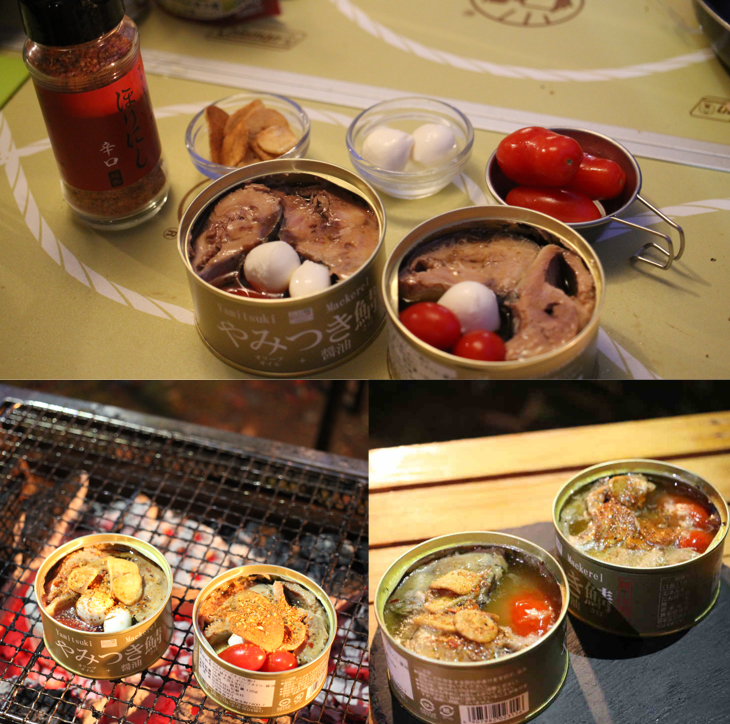 BBQコンロの上に缶詰をおき、モッツァレラチーズ、ミニトマトを加え、フライドガーリックを加える。グツグツしてきたら出来上がり。