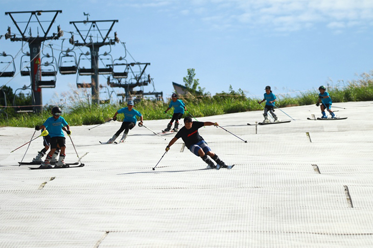 実は雪がなくても、夏のスキー場でスキーやスノーボードができちゃいます。「サマーゲレンデ」といって、プラスノーなどと呼ばれるブラシ状のプラスチック製マットをコースに敷き詰め、滑走できるようしたスキー場です。プラスノーのコースは雪よりやや摩擦がありますが、慣れてしまえば雪上のような滑走感が味わえるようになります。新緑のコースは爽快なうえ、滑走性を高めるためコースに散水しているので、思いのほか涼しく滑れます。