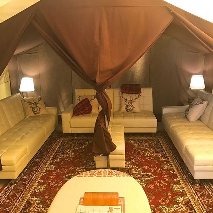 北アルプスが間近にそびえる白馬村(長野県)は、キャンプや登山、川遊びやスキーなど、通年アウトドアアクティビティが盛んな自然豊かなところ。国内最大規模のスキー場である八方尾根があることでも知られ、その麓の森には北米調の「白馬樅の木ホテル」が佇んでいます。ホテル併設のグランピングサイトはゴージャスそのもの。まるでリゾートホテルの館内で過ごしているような、上質なリビングルームやダイニングエリアが整っています。