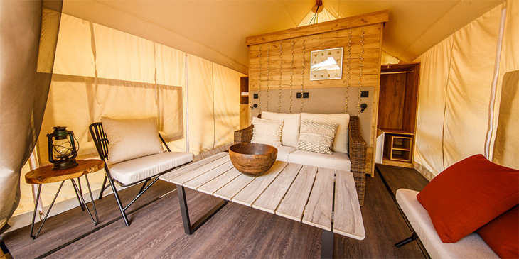 フランス製グランピングテントに滞在する1日1組限定の「グランピング宿泊&本格BBQディナープラン」のほか、ランチやディナーだけの日帰り利用も可能。グランピングテント内はWi-Fiも利用でき、細やかな部分までサービスが行き届いています。