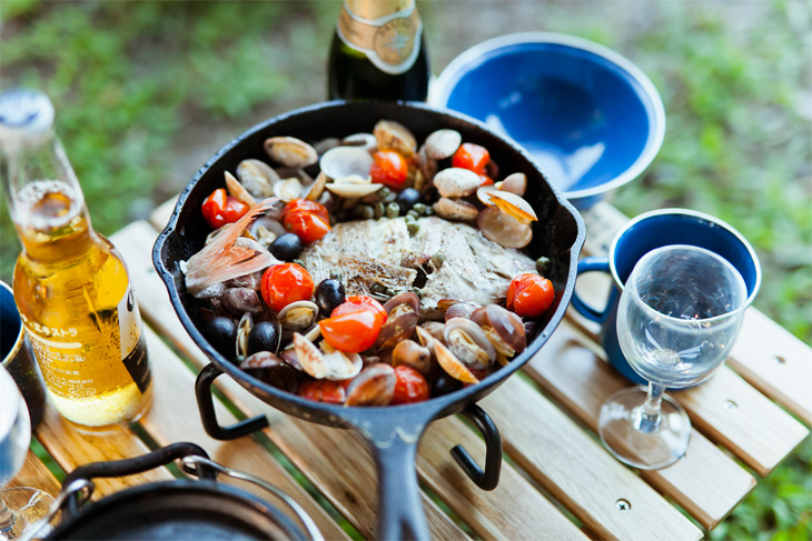 名古屋市内から車で1時間と行きやすく、大人の遊び場として18歳以上限定が利用できる「EARTH SHIP Camp&Field(アースシップ・キャンプ&フィールド)」。ベッドやラグなどインテリアにこだわった大型テントで優雅に過ごせ、機材倉庫に並べられたすべての用具を無料でレンタルできる。ダッチオーブンや焚火台、ホットサンドクッカーなどの調理器具、食器やカトラリーなどを自由に使い、好みの料理を作って楽しめる。