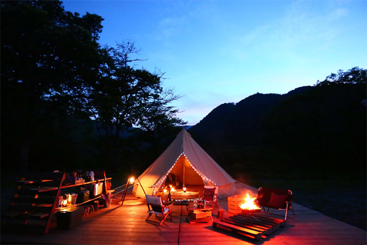 ライトアップされた夜のキャンプサイトも幻想的