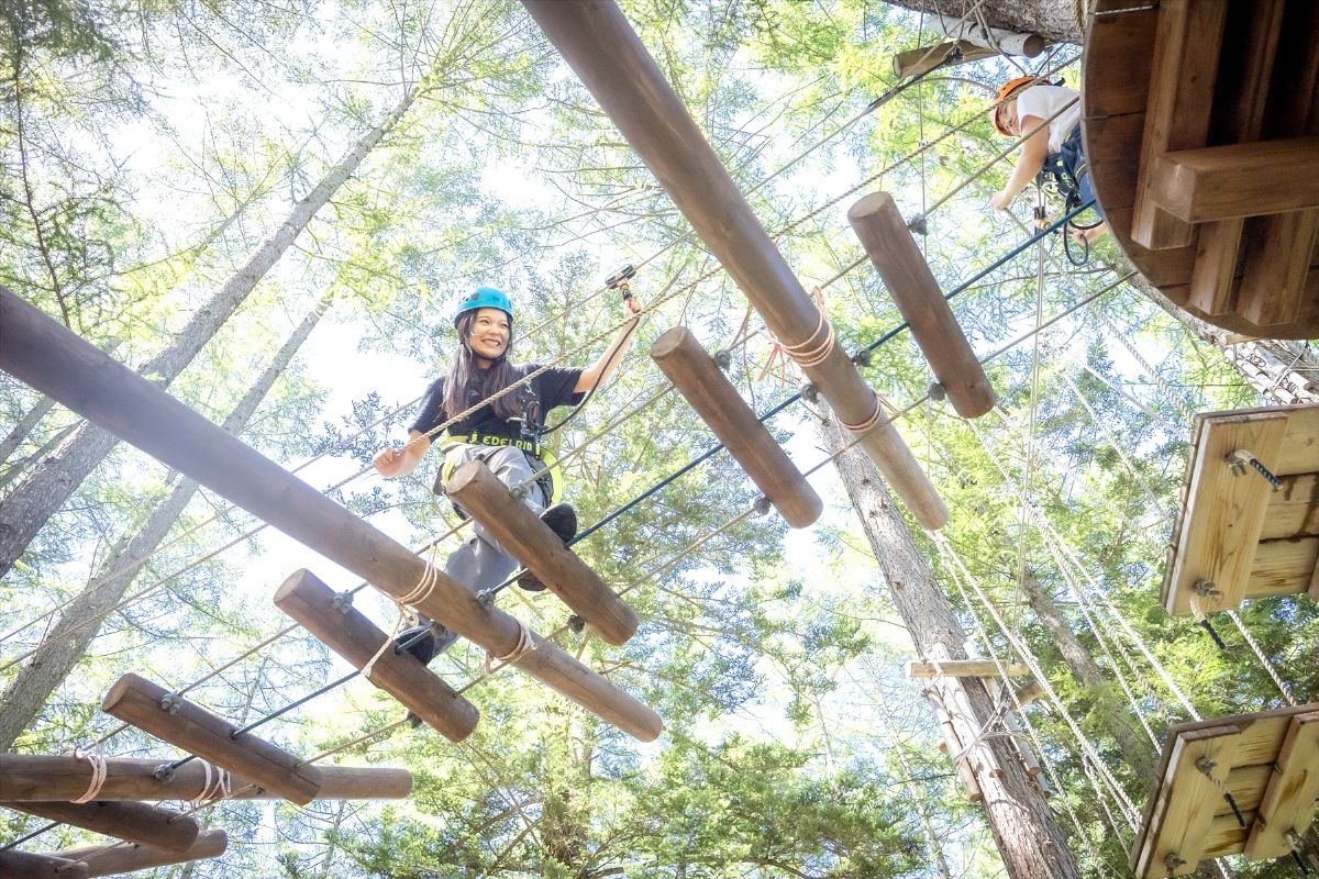 とりあえず楽しさのコツをつかんだアカネと苑子は、次にジップコースにトライ。長くて気持ちいい2本のジップラインからスタートし、ゴールもジップラインでその合計距離は約300mと、ジップラインが大好きな苑子は「楽しくてたまらなーい!」とのこと。