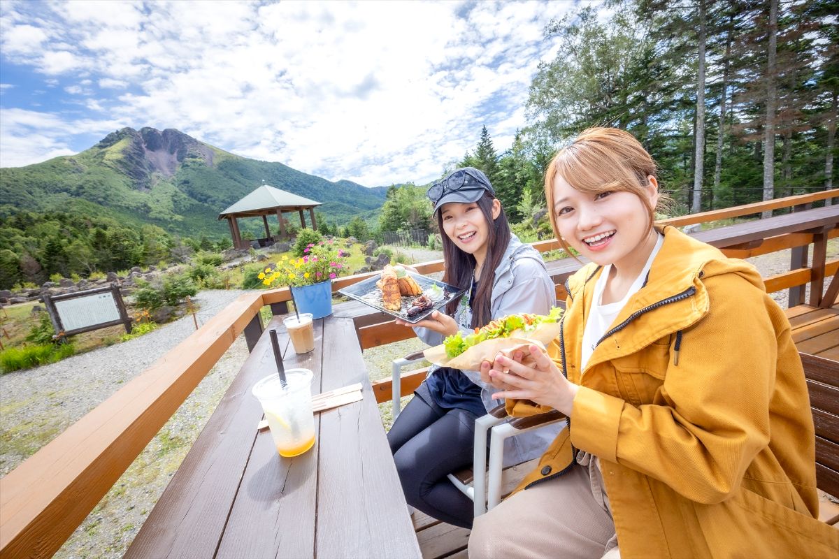 散策を楽しんだら、山頂での休憩は「天空カフェ」へ。美味しい食事や飲み物を各種用意していて、雄大な日光白根山を眺めながら楽しむことができる。冷たいドリンクだけでなく、温かい飲み物も用意。軽食で人気なのはフレンチトーストとホットドッグだ。