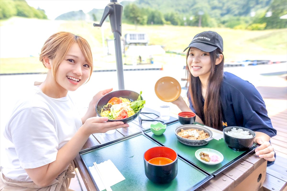 しっかり食事と取るならベースのセンターステーションにあるレストラン「プラトー」を利用するのもオススメ。アカネは、もはや丸沼高原のスペシャルメニューとなった絶品の「モツ煮定食」、ソノコは片品村産のトマトと野菜を使った「トマトみそつけ麺」をチョイス!