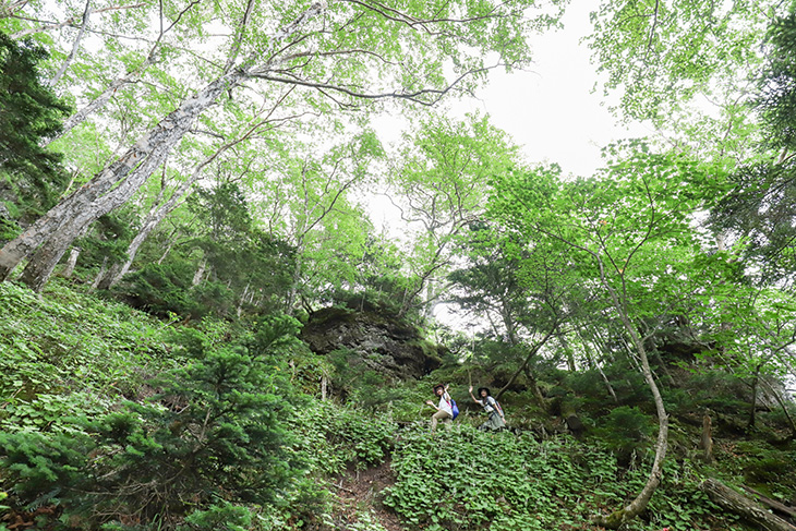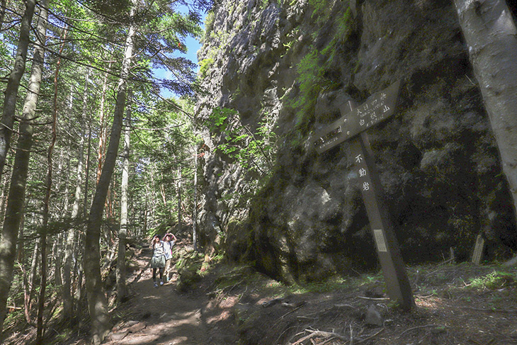 登山をスタートすると、しばらくは樹林帯の中を歩いていく。樹林帯の中はとても涼しく、またフィトンチッド効果により、身体も気持ちも軽くなったように感じることもあるが、自分のペースを守って歩こう。途中の「不動岩」では、ぜひ足を止めて巨大な岩の壁の上部まで見上げてみよう。