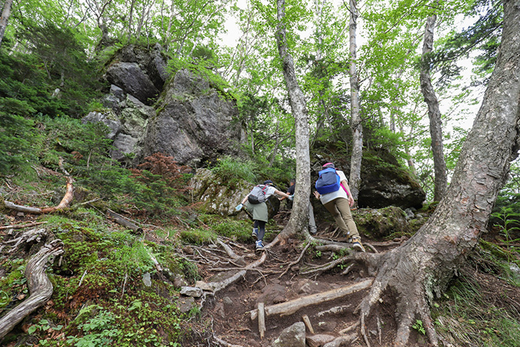 空がよく見えるようになってくると、そろそろ樹林帯も終盤。標高も上がってきているので呼吸を乱さないように、そして涼しいとはいえ汗もかきすぎないように、焦らず慌てずに歩こう。