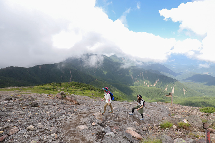 森林限界を超えると、足場が砂利や岩場のところがほとんど。足場が動いて、歩きにくく感じるかもしれないが、ここでも焦らず、慌てず、一歩一歩しっかりと足場を確保しながら登るのがおすすめ。