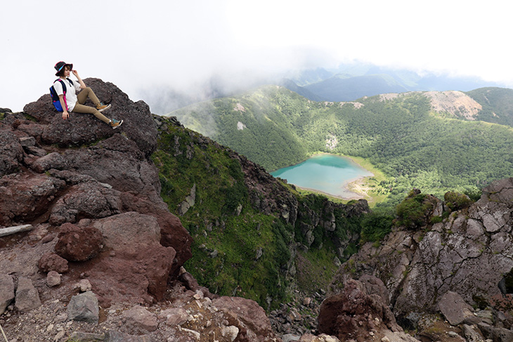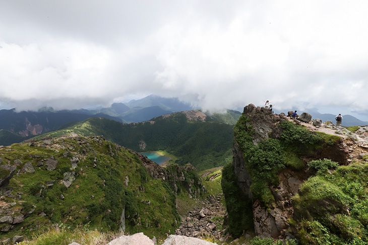 写真の奥に男体山や中禅寺湖も見えるが、ちょっと残念な感じ。でも眼下の五色沼には雲の切れ間から太陽の光が届き、エメラルドグリーンの神秘的な色を放つ。