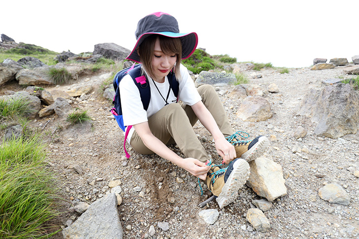 靴のひもを締めなおして下山の準備。忘れがちだが、足元がしっかりしていると下山もラクになる。