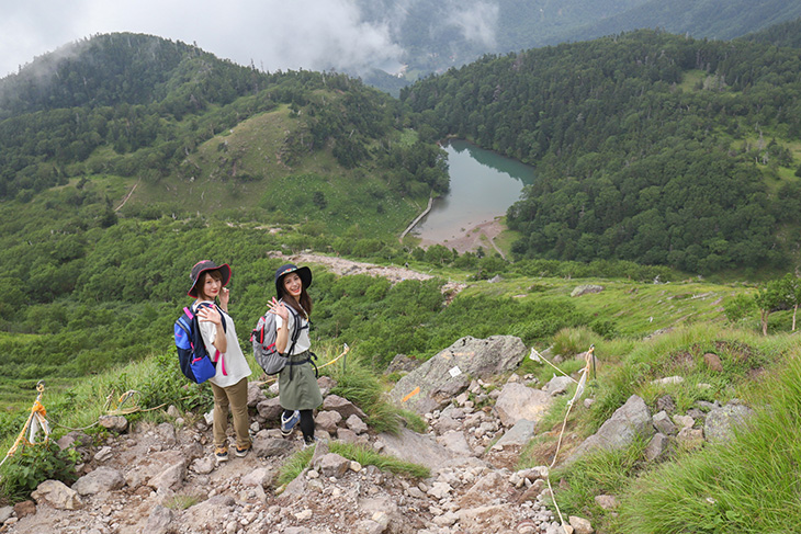 帰りのルートは弥陀ヶ池ルートを選択。眼下に弥陀ヶ池などが望めて眺望の素晴らしいルートだが、急な岩場が続くので、心配な人は登ってきたルートを戻るのがおすすめ。