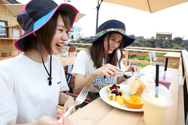 山頂駅エリアまで戻って、無料の足湯でひとまず疲れを癒やしてから天空カフェへ。「ご褒美、ご褒美♡」とシフォンケーキ・スペシャルを注文しシェアすることに。
