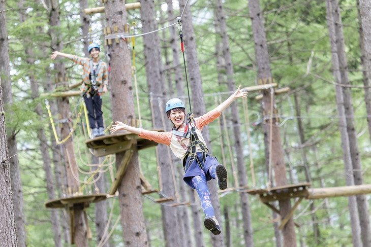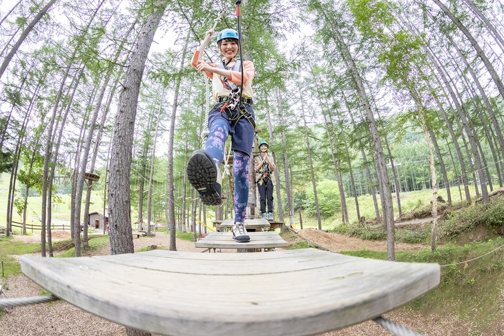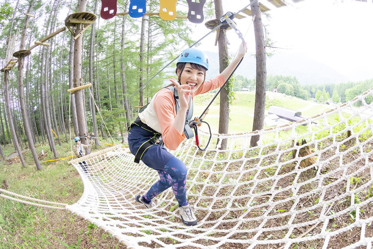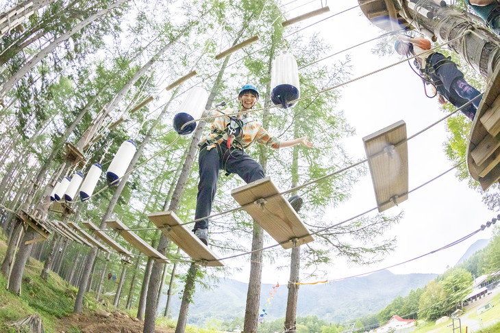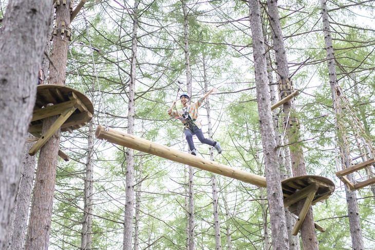 まず丸沼高原に来たら、ぜひチャレンジしてほしいアクティビティのひとつが「ツリーアドベンチャー」だ。高さ2mから10m以上の木の上に足場が作られ、木から木へとロープや吊り橋などのエレメントを移動していくアクティビティだ。トライする人はハーネスを装備し、ワイヤーに接続された状態で移動するから、例え途中で失敗しても落下してケガをするなどの心配はまったくない。安全だけど、ドキドキ感やスリルが味わいながら楽しめるというのが、このツリーアドベンチャーの魅力のひとつなのだ。