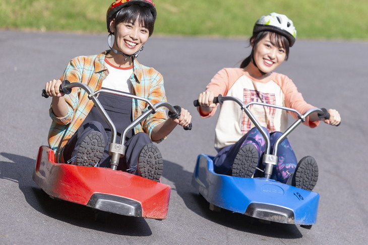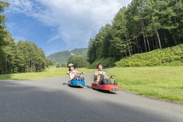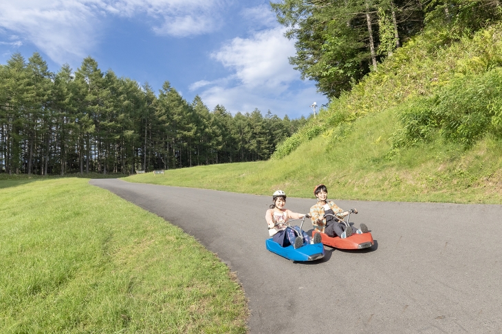 丸沼高原のアクティビティの中でもツリーアドベンチャーと並んで、大人や子供に関係なく人気が高いのがサマーリュージュだ。ゲレンデの傾斜を利用して、舗装されている道を「リュージュ」という専用のカートに乗って駆け下りていくのだ。