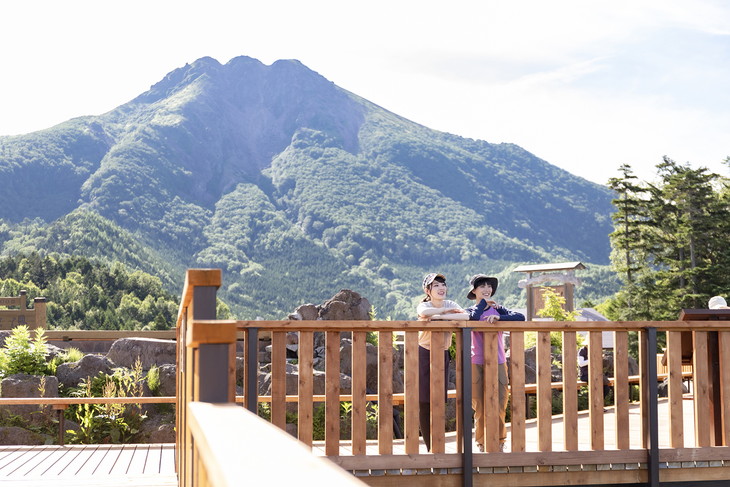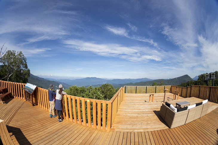 丸沼高原では標高2000m地点の山頂駅まで約15分でアクセスできる「日光白根山ロープウェイ」が運行。乗車中の眺望も楽しみだが、山頂駅近くに設けられている「天空テラス」からの絶景は期待を裏切らない。
