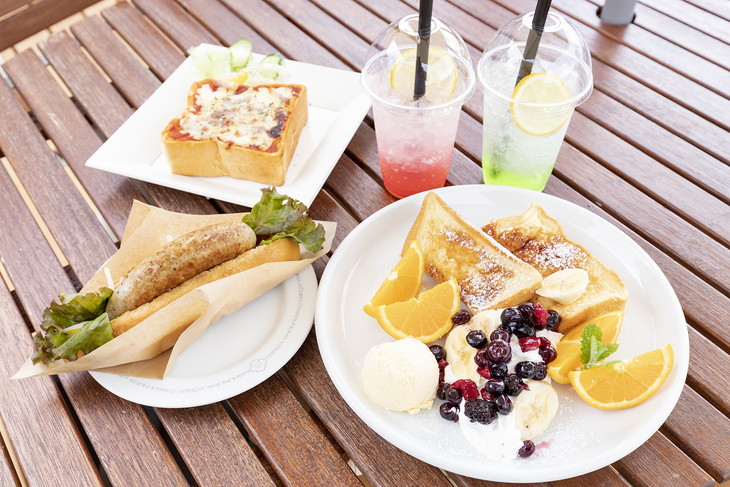 また天空テラスに併設されている「天空カフェ」では、パスタやホットドックにフレンチトーストなどの軽食、コーヒーやスムージーにトマトジュースといった各種ドリンク類を用意。ホットドックは、ハムやソーセージ工房として有名な「シェモア」のオリジナルソーセージを使用した絶品。ぜひ、ランチなどにも天空カフェを利用しよう!