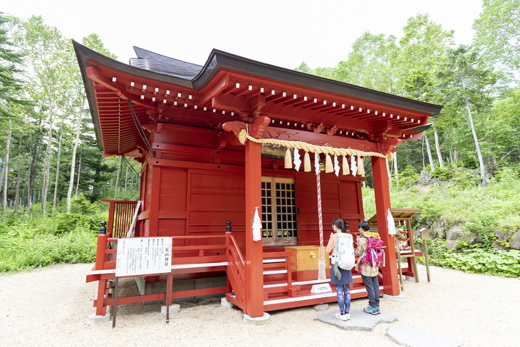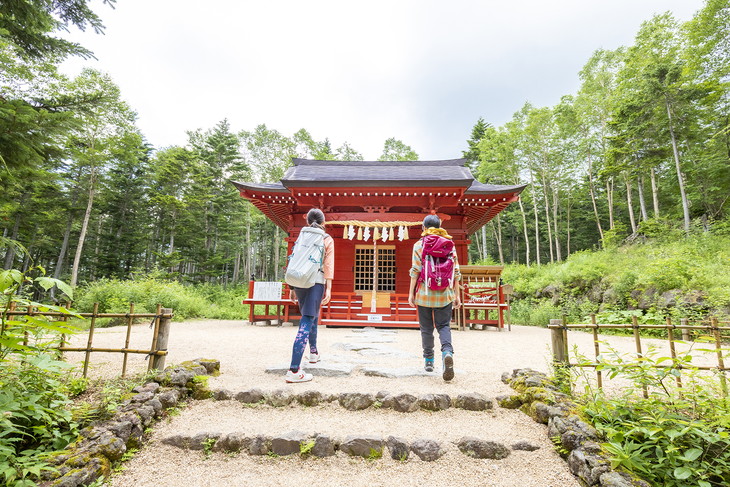 まずは山頂駅近くの「二荒山神社」に立ち寄って、お参りしてからスタートしよう。緑多き森の中に静かに佇む鮮やかな赤色の社が、より荘厳な雰囲気を醸し出している。