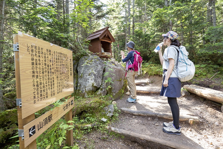 史跡散策コースにもなっているルートを辿りながら登山ルートへ。途中の「大日如来」に登山の安全を祈願しながら、ちょっと一息。