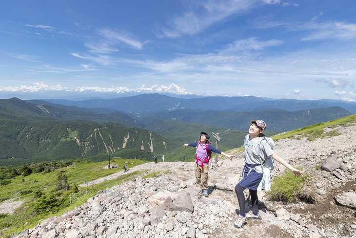 山頂駅や天空テラスでは、まず日光白根山の雄姿が間近に迫る。テラスでは日光白根山を背にし、武尊山や至仏山などのパノラマを楽しむことができるが、空の広さと青さ、空気の爽やかさも相まって、しばしその素晴らしさに目が釘付けになってしまうかもしれない。
