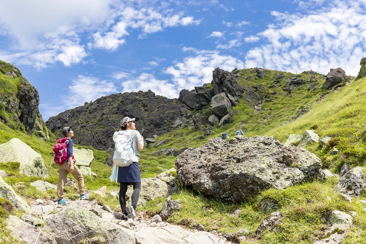 緑の世界を抜けると、森林限界を超え、気持ちいい青空が広がっている。足場が砂利や石でゴロゴロしているところが増えて少し歩きにくくなってくるが、慌てず、焦らずにゆっくりと登ろう!