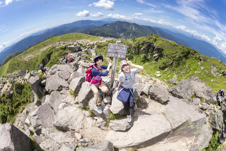 念願の山頂に到着!360度の大パノラマの絶景はがんばったご褒美。登りきった人だけが味わえる感動をタップリと満喫してきてほしい。