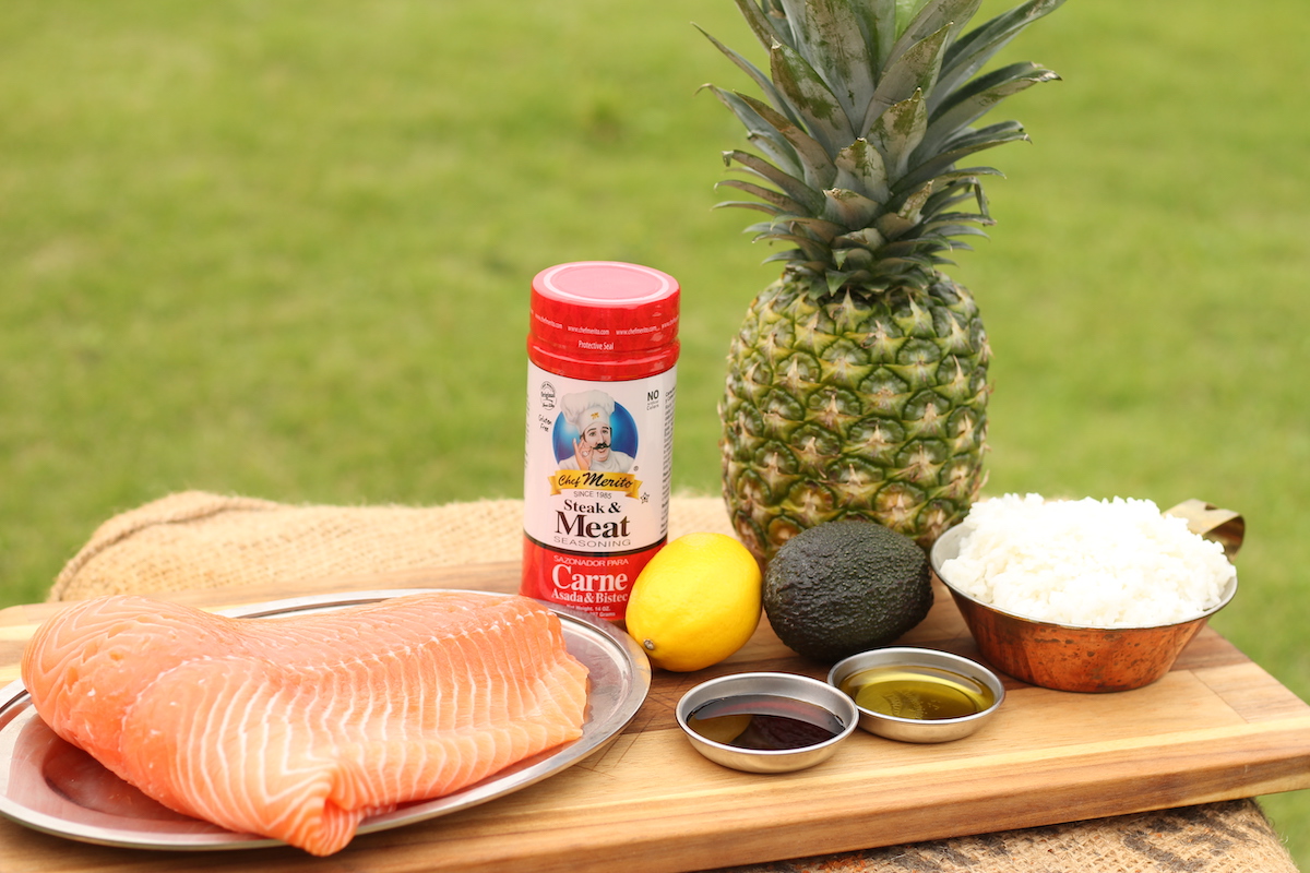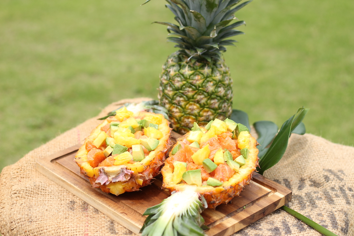 ご飯の上にサーモン、アボカド、パイナップルを散らす。