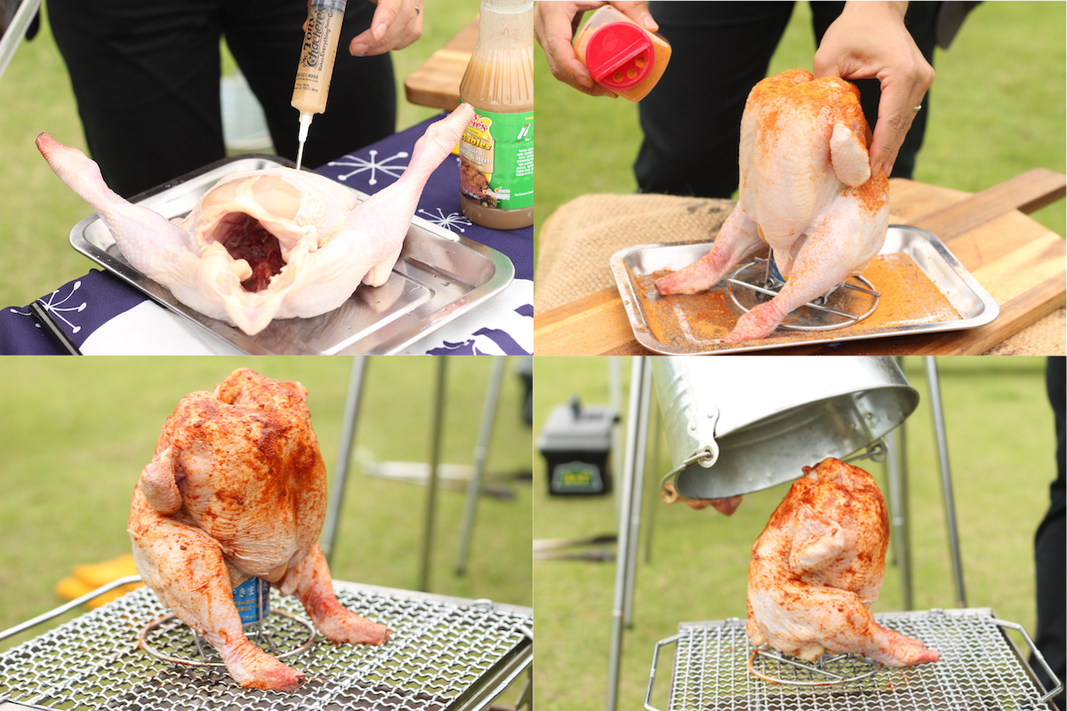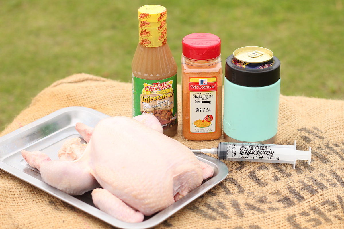 缶ビールに鶏肉をおしりから入れて、立たせる。