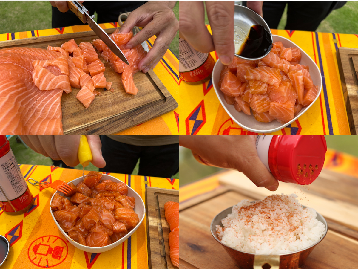 サーモンは角切りにして、醤油、オリーブオイル、スパイスをかける。