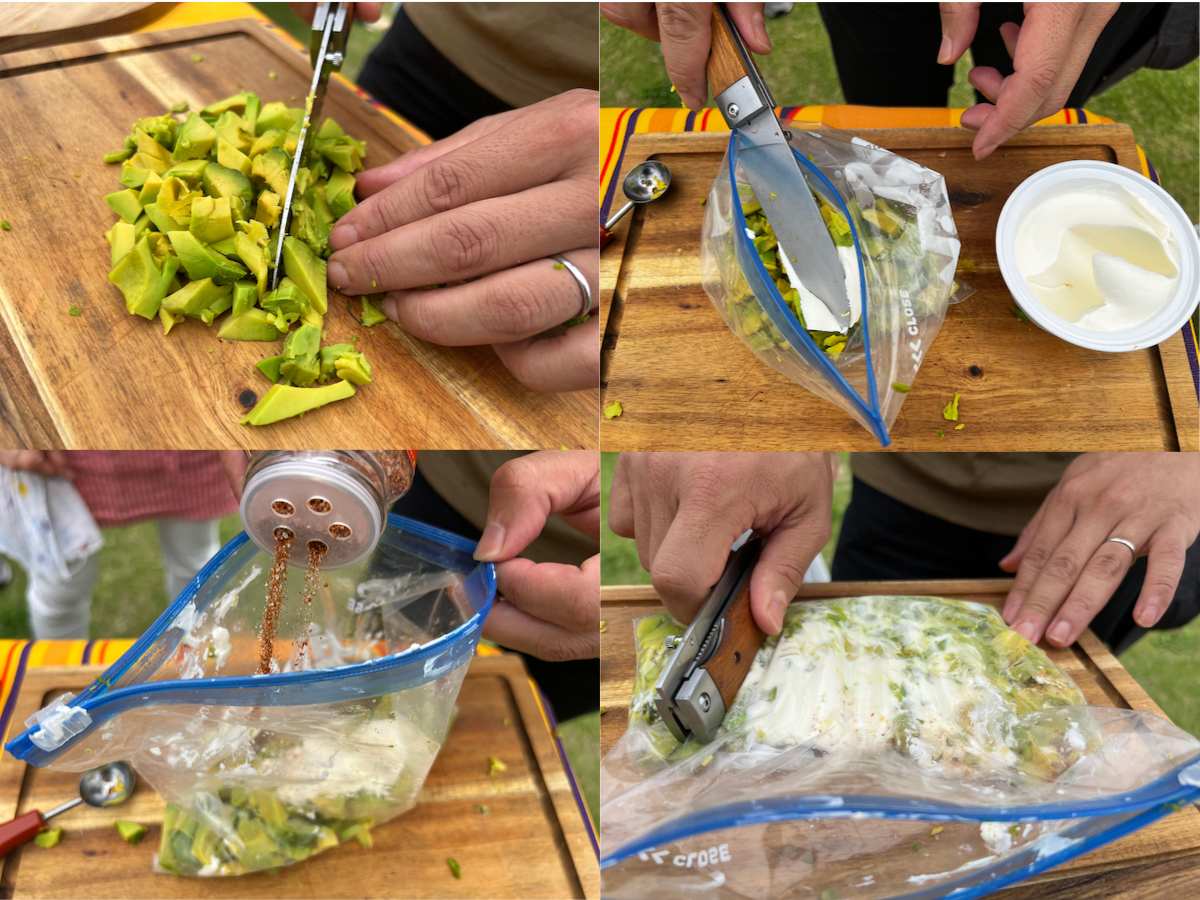 アボカドはくりぬいて、2つのビニール袋に入れて、レモン汁をかけて、たたく。