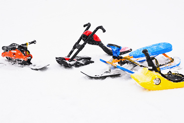 ソリにはいろんな種類があり、ハンドルやブレーキが付いた進化形のソリもあります。写真のソリは右から、ジップフィー、スノーレーサー、スノーライダー、スキー・ポッカール。これらのソリは別料金でレンタルできます。曲がったり減速したり、自分でコントロールできるので、よりアクティブなソリ遊びが体験できます。