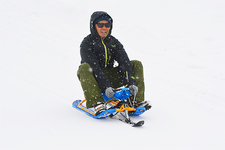 スノーライダーはバイク型のソリ。ハンドリングがしやすく小回りが効き、重心が後ろにあるのでスピーディーに感じます。ブレーキも効くため安全性もあります。