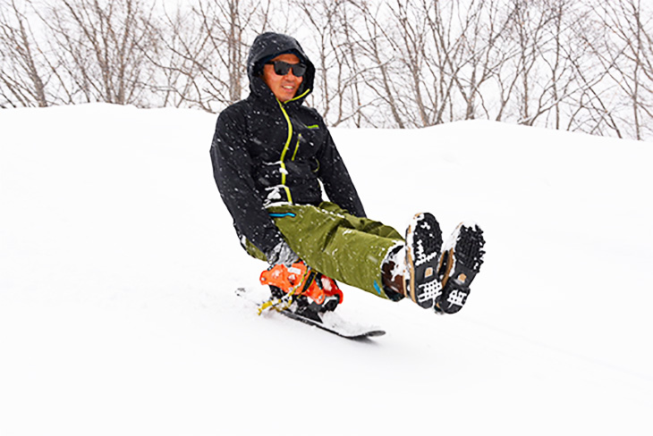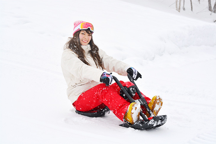ソリはスキー場のコース内での滑走は禁止されており、基本的にキッズパークなど決められた場所で楽しみます。しかし、水上高原スキーリゾートにはリフトを利用して長い距離を滑れるソリ専用の「Sled Rideコース」を設置しており、レンタルしたソリで滑走できます。写真のソリはジップフィー。前についているバーと体重移動で操作しながら斜面を滑走します。