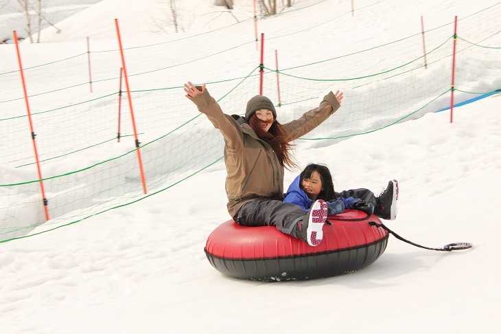 ニセコHANAZONOリゾートの麓にはエリア内最大規模のチューブパークがあり、大きな浮き輪に乗って雪上を滑り降りるスノーチューブは、子供と一緒に楽しめるオススメのアクティビティ!