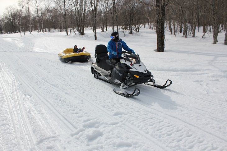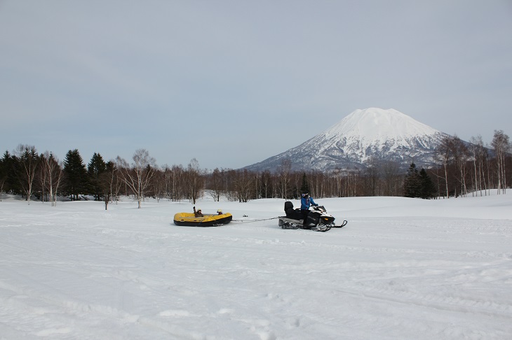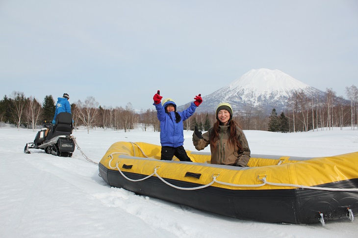 ニセコレッジスキーリゾートでは、川下り用のボートに乗り、スノーモービルに引っ張られながら広い敷地内を疾走するスリリングなアクティビティが楽しめる。