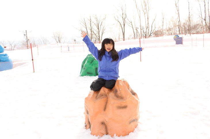 雪上に設置されたカラフルな置物に乗って遊んだり、ソリやチューブで遊ぶこともできる(ソリ、チューブのレンタルは有料)。