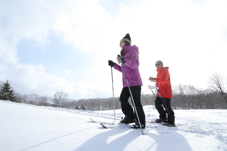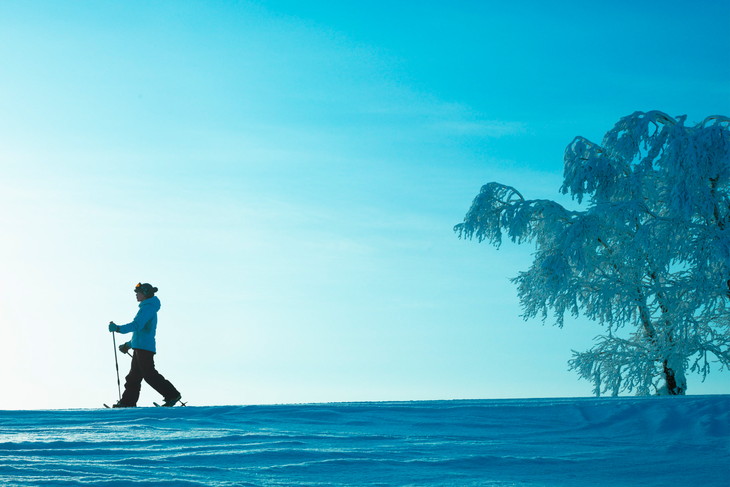ルスツの自然を知り尽くしたガイドと一緒に、白銀の世界へ散策に出かけよう。短いスキーを履いて散策する「スノーランブラー」での雪原ハイキングも行なわれている。