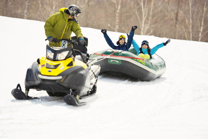スノーモービルが引っ張るゴムボート(ラフティングボート)に乗り、雪上を滑走するアクティビティがスノーラフティング。