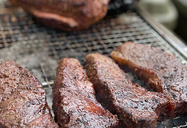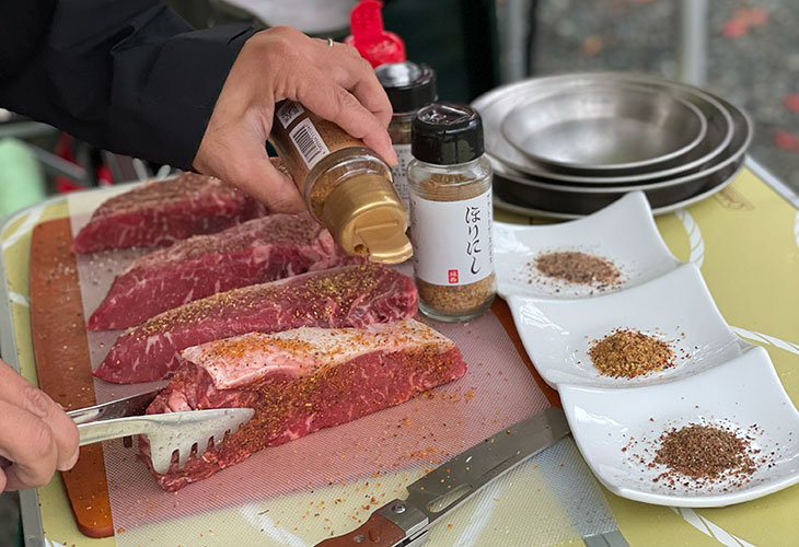 3大スパイスとして取り上げられることが多い「ほりにし」「黒瀬のスパイス」「マキシマム」はキャンパーの間でも評価の高い調味料です。まずは分厚い豪快な肉にスパイスを振って焼いていきます。