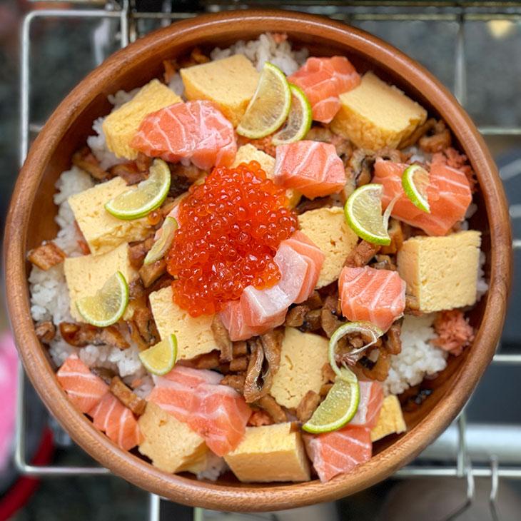 洋食が多く並ぶイメージのアウトドア/キャンプですが、和食がテーブルに並べばゲストのアッと驚く&喜ぶ顔が見れること必至です! 酢飯の代わりに、アウトドアスパイスの混ぜご飯をつかった、たまごとサーモンといくらとアナゴの彩り丼で、家族と友人の胃袋を満たす至福の時間を共有しましょう。