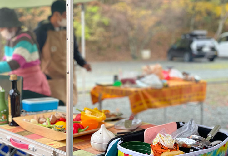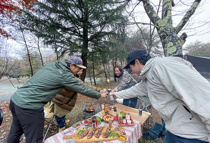 食品メーカーで商品開発担当である松倉さんとメニュー開発室の敏腕女史、星川さん。そんな2人がアウトドアスパイスを使った絶品料理を振る舞ってくれる当企画。数日前から打ち合わせに打ち合わせを重ねメニューを考案、買い出しから準備まで完璧にこなしてくれました。