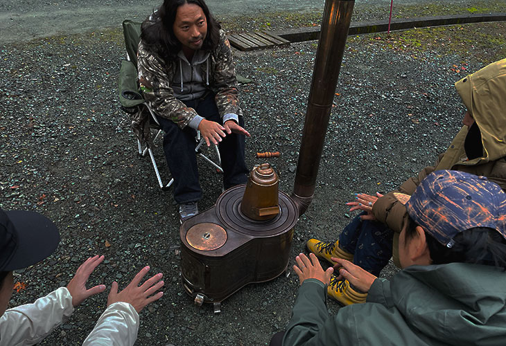 食後にはレンタルした薪ストーブの周りで冷えた身体を温めました。食後のコーヒーも美味しくいただきましたよー!!