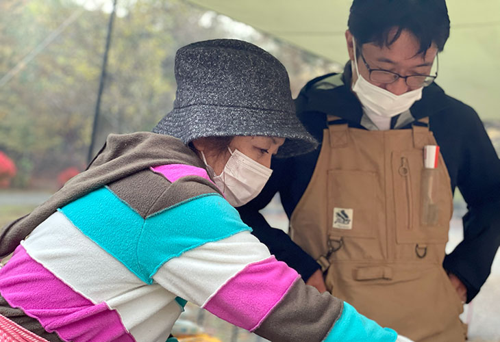 見よ、お二人の真剣な眼差しを(笑)。美味しく楽しいキャンプ飯の裏側にはゲストに喜んでもらうために提供しようというたぎる思いと商品開発担当魂を垣間見た瞬間でした。