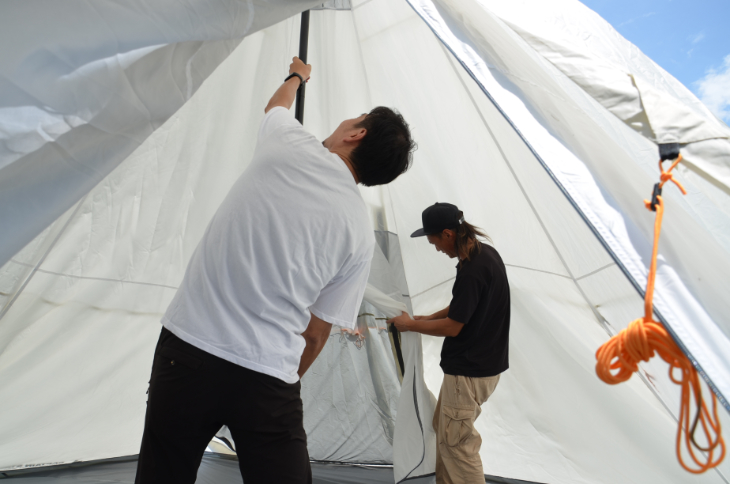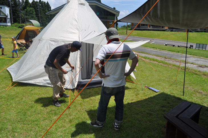 常設テントサイトを予約するのはキャンプ初心者の方多いということで、夜に風が強かったりしてテントが倒れることがあった場合、キャンパーだけでも直せるように、高橋さんがテントの設営、メンテナンスの仕方をレクチャーしてくれる。