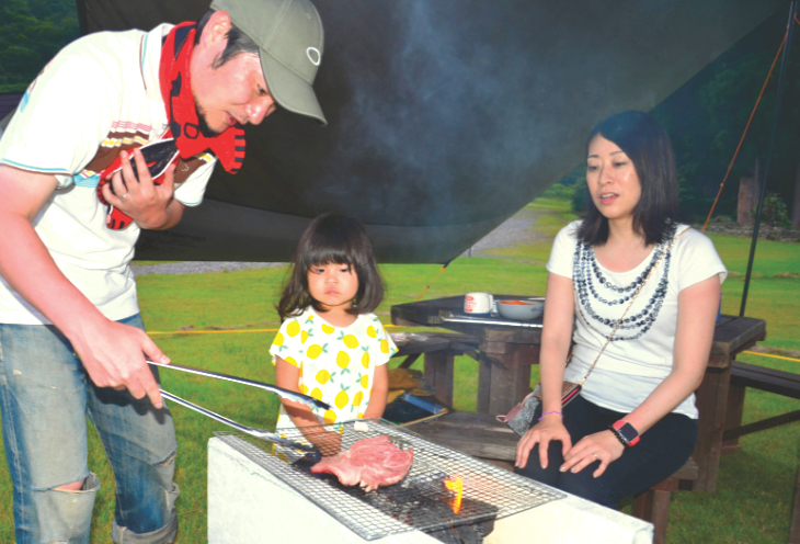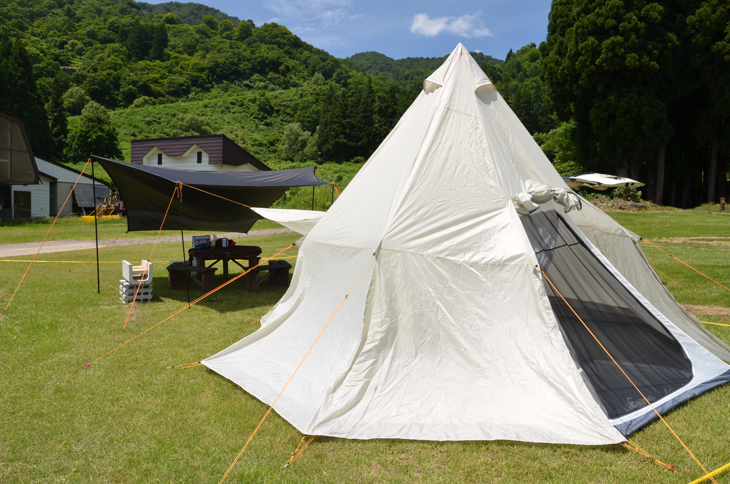 常設テントエリアではテーブルセットなどはすでに設置されており、テント設営もレクチャーしてもらえるので、慣れていない人でも短時間で設営ができる。