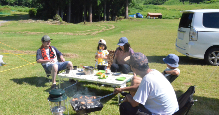 アッキーファミリーはレンタル付きの常設サイトで、トノファミリーは常設サイトの目の前のフリーサイトでオートキャンプをすることに。