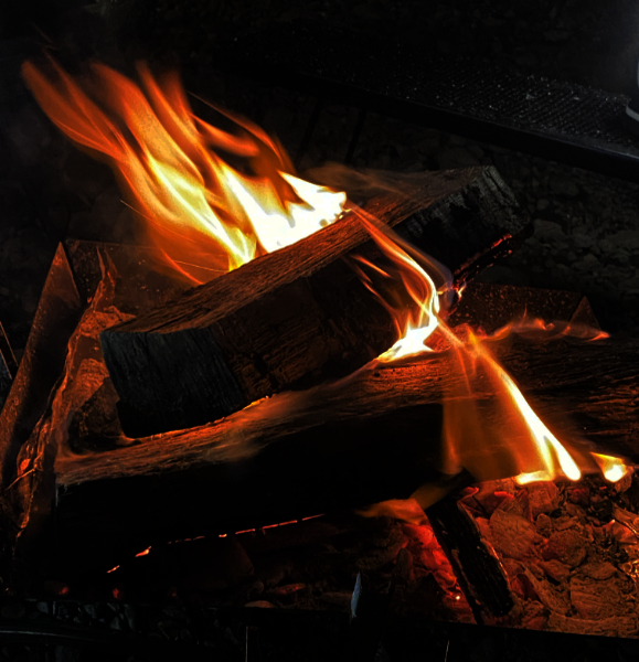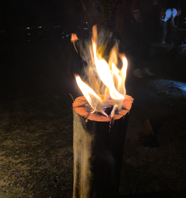 日が落ちると周囲は一気に暗くなる。BBQもひと段落したら、管理棟で購入したスウェーデントーチと、みんなで薪割り体験をした薪を使って、しっぽりと焚火時間に突入。