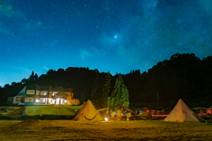 星降るキャンプ場では、オートキャンプサイトだけでなく、グループで利用できるサイトや、ドッグラン付きサイト、そして、テントやタープ、寝袋などキャンプに必要なギアをひと通りレンタルできる常設テントサイトといった様々なサイトがある。